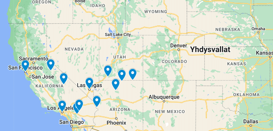 - Näet myös hieman vähemmän tunnettuja, mutta silti upeita paikkoja kuten Palm Springs, Joshua Treen kansallispuisto ja Lake Powell.